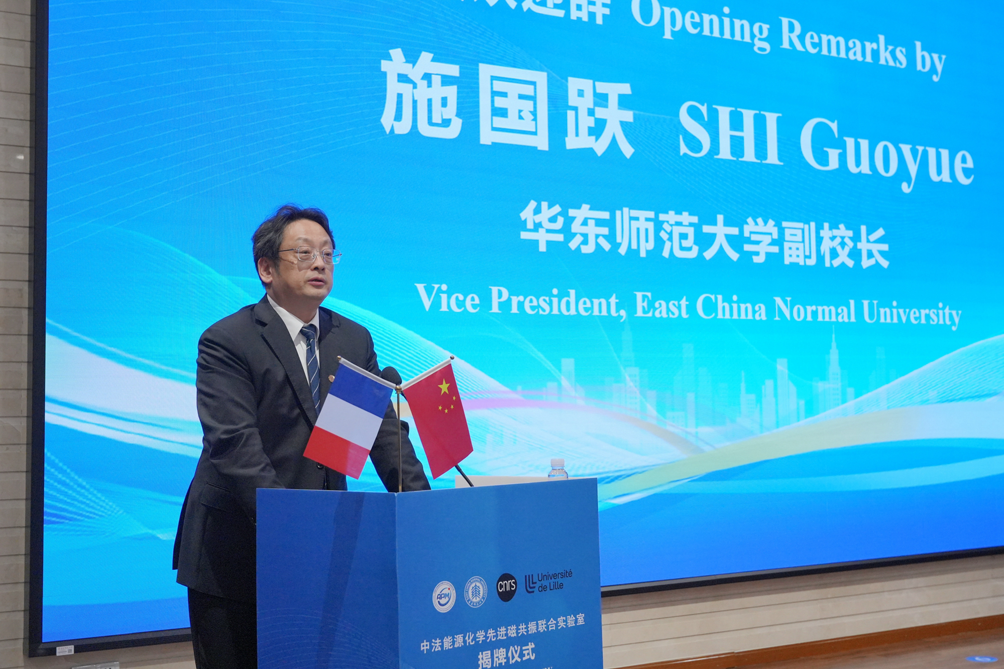 活动伊始,施国跃在致辞中向远道而来的法国嘉宾表示欢迎。他指出,华东师大对法合作历史悠久,成果丰硕。当前,中法三方基于在磁共振与能源化学领域的深厚合作基础,联合成立国际合作实验室,为学校中法合作添砖加瓦。他指出,中法三方的合作历史已逾二十年,长期以来形成了内容扎实、成果丰硕的协同研究格局。三方团队在能源化学的不同方向取得了重要的研究进展,在高分辨固体核磁共振、催化剂结构演化机制、电池机制研究等领域作出了突出贡献。他强调,此次联合实验室的成立,源自中方(华东师大与中国科学院精密测量院)和法方(CNRS、里尔大学)在磁共振技术及能源化学研究上的高度互补性,联合实验室将围绕催化与能源重大科学问题,发展高场固体核磁、原位磁共振等关键技术,构建中法更加紧密的科研合作机制,并在人才培养、学术交流及科研攻关等方面持续推动实质性合作。他表示,希望联合实验室立足双方深厚的合作基础,持续在关键科学领域取得突破性成果,努力建设成为引领中法科技协同创新的示范性平台。