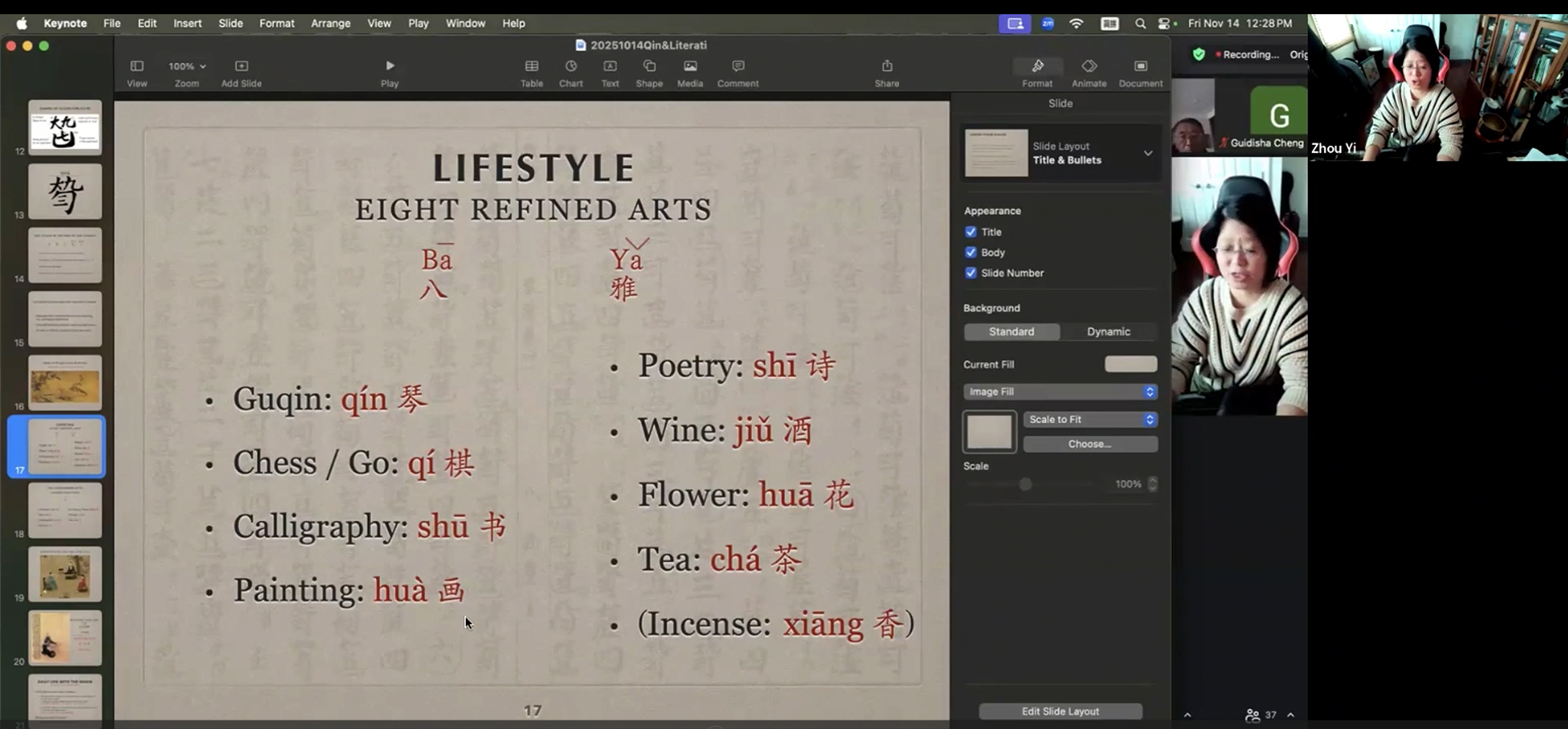 当地时间11月14日中午12:00,华美孔院的“午间中文(Lunch and Learn)”系列2025年秋第三期线上中国语言和文化专题活动成功举办,吸引了50余名美国民众线上参与。本季度活动特邀纽约知名琵琶与古琴演奏家、教育家周懿女士担任主讲,带领美国民众进行了一场跨越时空的雅集对话。