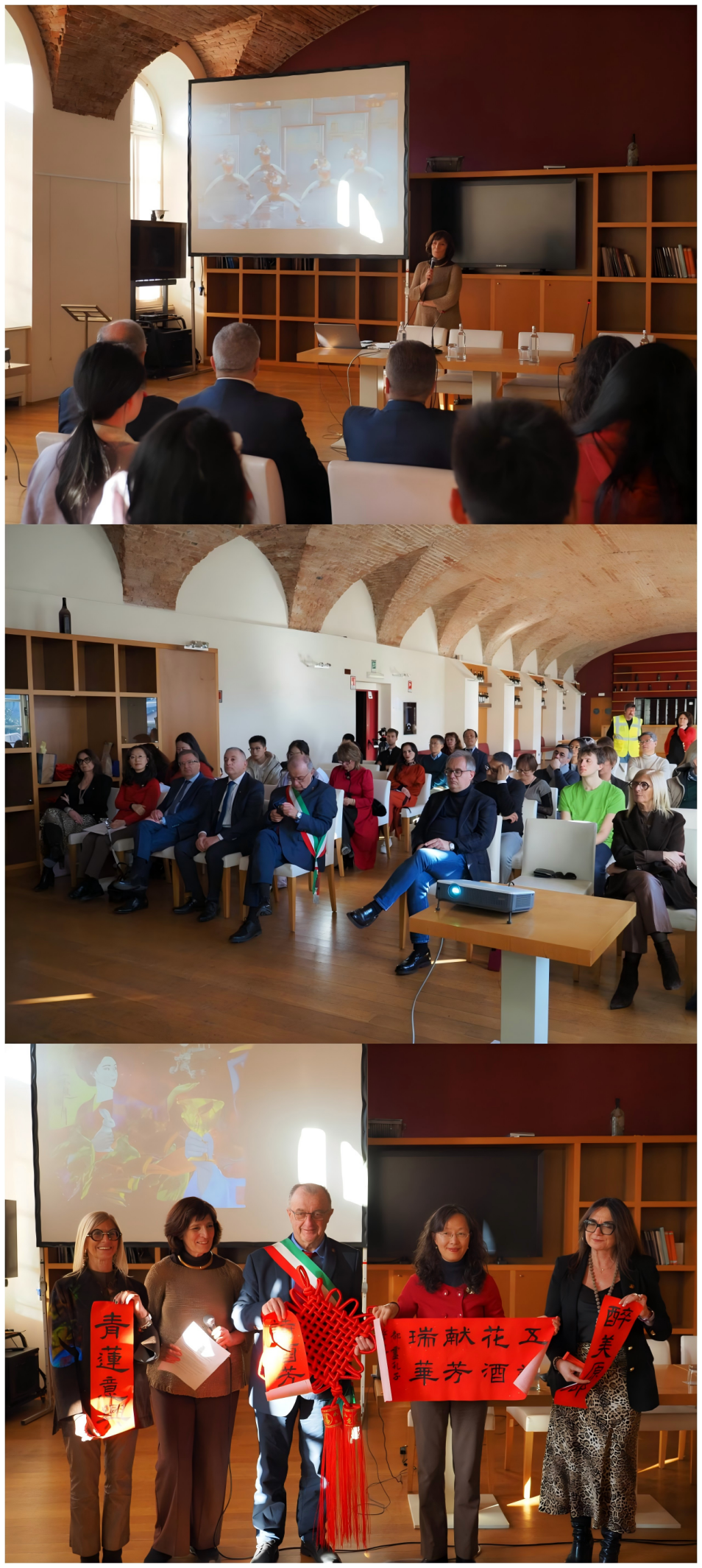 来自皮埃蒙特大区的官员、库内奥储蓄银行基金会副主席、巴罗洛市政府官员及博物馆馆长先后发表讲话。前任市长雷娜塔·比安科女士(Renata BIANCO)热情洋溢地为活动送上祝福。都大孔院中方院长戴岚为市长送上象征和谐、圆满的中国结,并赠送特制的应景对联“青莲意象,醉美原乡”。在喜庆氛围中,意方院长史芬娜(Stefania STAFUTTI)围绕中国年俗传统与艺术话题展开分享,并播放马年春晚节目《武BOT》视频,将当代科技成果融入巴罗洛新春中国故事会之中。