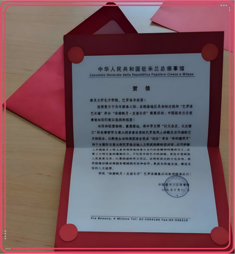 在喜迎新春的日子里,这幅富含中国文化元素、以“谪仙”李白为主题的画作《举杯邀明月》从此驻留皮埃蒙特的名胜酒乡。都大孔院与巴罗洛市政府携手推进中意文化合作,将为源源不断的中意故事、文化对话、艺术创作以及商贸交流合作开启新篇章。