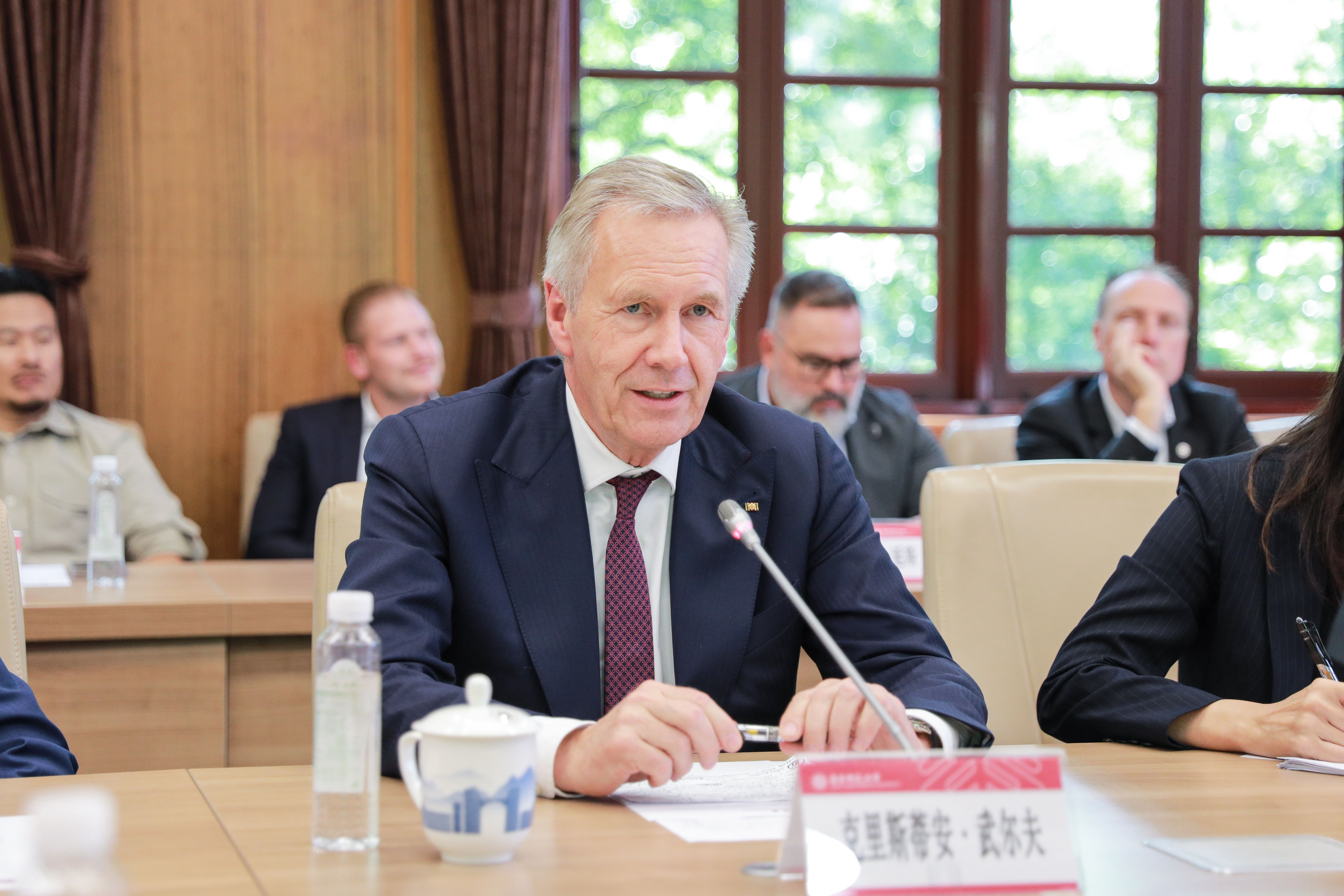 围绕人工智能、环境保护、汽车产业合作等当前中德两国共同关注的重要议题,武尔夫指出,中德不仅拥有广泛的共同利益,更肩负着推动全球可持续发展的共同责任。他强调,中德乃至中欧人民应携手并肩,共同维护世界和平,坚守联合国宪章所承载的多边主义原则与国际共识。他特别援引了洪堡、孔子与老子三位东西方文明中影响深远的智者,以他们的思想智慧为例,生动阐释了文明互鉴对于深化中德相互理解、促进民心相通的重要价值。
